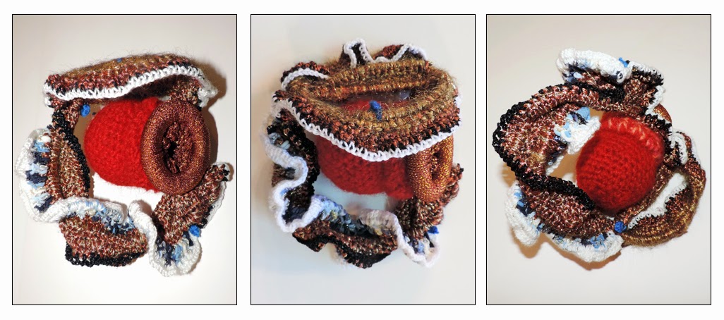 Crocheted wool, metallic yarns, wood and metal